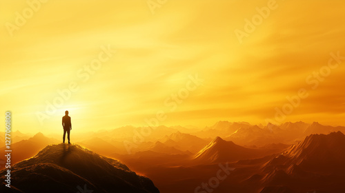 A person overlooking ancient mountains in golden light