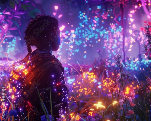 A person standing in a wide field, mesmerized by the vibrant display of fireworks above, surrounded by the flickering lights and the night sky.