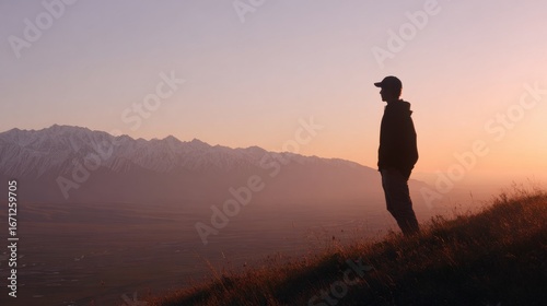 A person stands on a hill, silhouetted against a vibrant sunset. The distant mountains and golden sky create a tranquil atmosphere, capturing a moment of reflection.