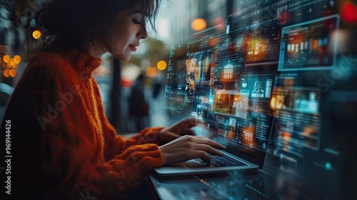 A person using a laptop to browse an online store, with multiple product images and shopping carts displayed on the screen.
