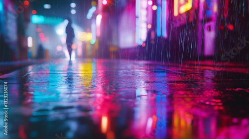 A person walking through a neon-lit street at night, with reflections on the wet pavement creating a vibrant urban scene.