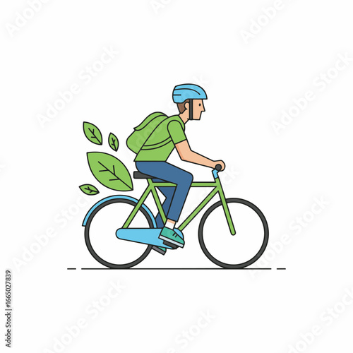 A person wearing a helmet rides a bicycle with leaves, promoting eco-friendly transportation.