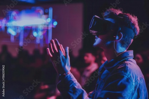 A person wearing a VR headset, engaged in an immersive experience at a tech event.