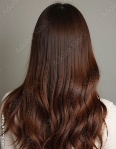 A person with long, wavy brown hair is turned away, showcasing the beautiful waves and shine. Neutral background that highlights hair texture. Hair care, the effect of cosmetics Generative AI
