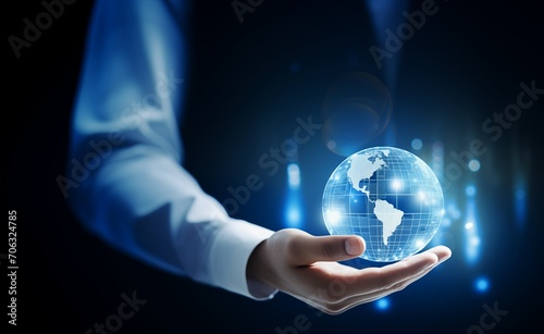 A Person's Hand Holding a Transparent Digital Globe with Light Effects