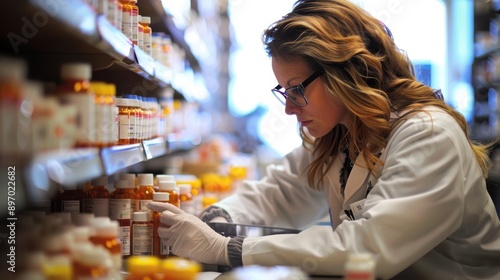 A pharmacist organizing prescription bottles in a pharmacy, ensuring accurate medication management for patients.