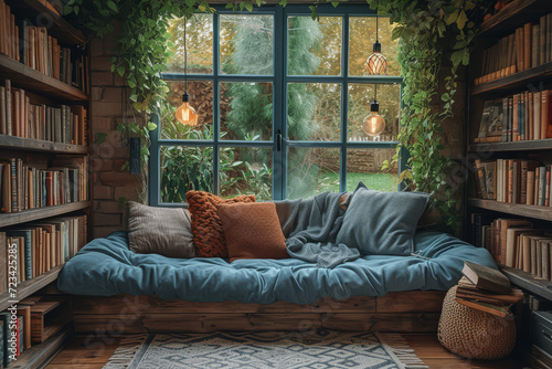 A photo of a cozy reading nook, edited with a matte finish for a soft, inviting atmosphere. Concept of leisure and relaxation in vintage style. Generative Ai.
