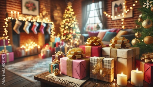 A photorealistic close-up of colorful wrapped gifts with bows on a table, set against a blurred festive interior featuring a Christmas tree and holiday decorations.