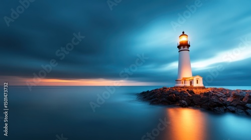 A picturesque lighthouse standing tall on rocky shores, illuminating the serene seaside surroundings during sunset, evoking a sense of calmness and guidance in nature.