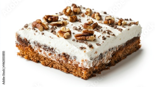 A piece of moist carrot cake topped with cream cheese frosting and walnuts on a white background