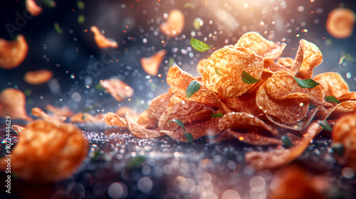 A pile of potato chips with green leaves scattered around them. The chips are golden brown and appear to be freshly made. Concept of indulgence and enjoyment