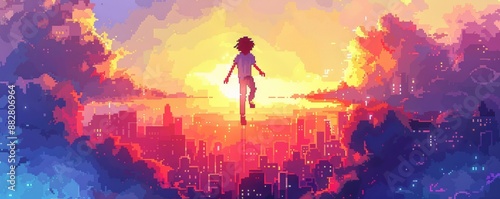 A pixel art illustration of a video game character jumping and running through a pixelated landscape, representing the world of entertainment and virtual reality.