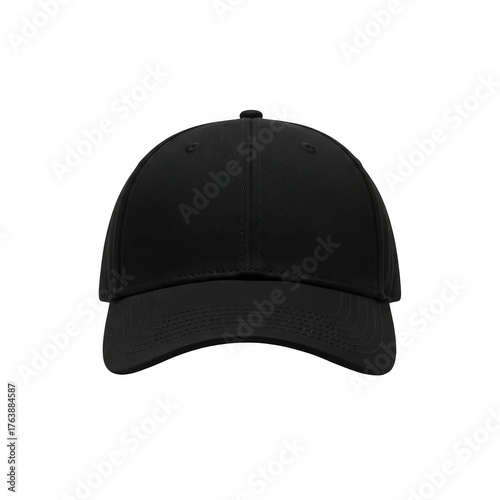 A plain black baseball cap with a curved brim and structured front panel isolated on transparent background
