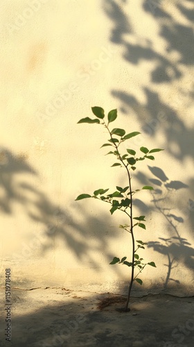 A plant growing in a pot casts an impressive shadow of a tree on a plain wall, symbolizing growth and potential