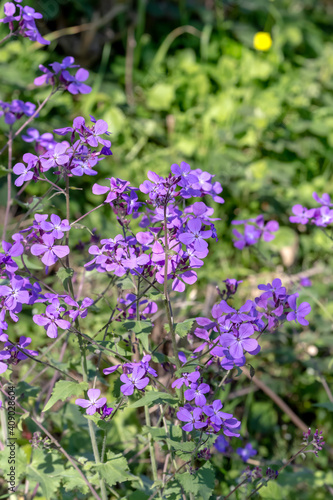 A plant (Matthiola farinosa) with violet flowers blooms by the sea