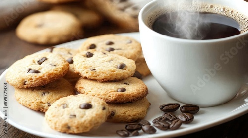 A plate of chocolate chip cookies beside a steaming cup of coffee.
