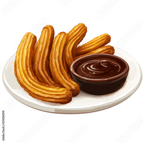 A plate of churros with chocolate dipping sauce, isolated on transparent background.