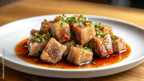 A plate of fried pork belly with a crispy golden texture, topped with fish sauce and sprinkled with fresh herbs, set against a light wooden table with natural lighting