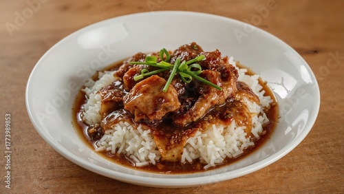 A plate of rice topped with stewed meat and sauce, garnished with fresh green herbs.