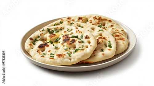 A plate of soft milk-based naan bread, isolated on a matte white background with gentle shadows for a minimalist, elegant presentation