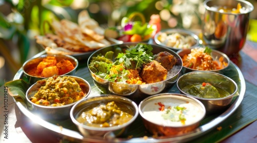 A plate-sized thali filled with regional street food specialties like chaat, pakoras, and vada pav, offering a delightful culinary adventure through India's bustling markets.