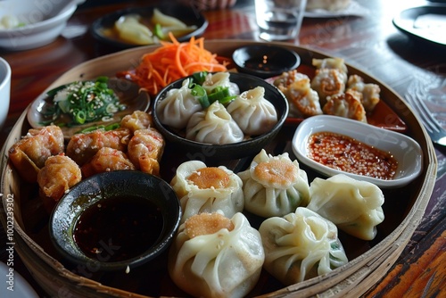 A platter of assorted dim sum with dumplings, buns, and dipping sauces