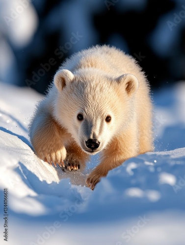 A playful animal running through the snow, showcasing its fluffy fur and curious expression.