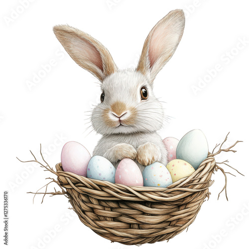 A playful bunny sitting upright in a cozy basket with pastel-colored eggs, transparent background, PNG