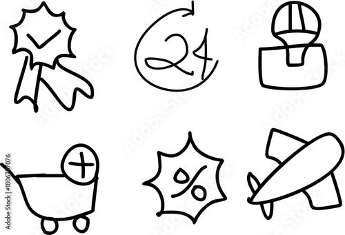A playful collection of doodle-style icons featuring discounts, fast delivery, secure packaging, add-to-cart actions, and travel themes, capturing modern shopping energy.