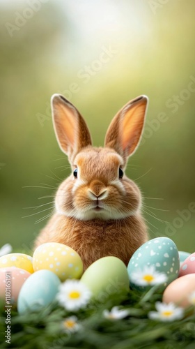 A playful Easter background with a bunny peeking out from a pile of colorful eggs surrounded by soft green grass and scattered daisies