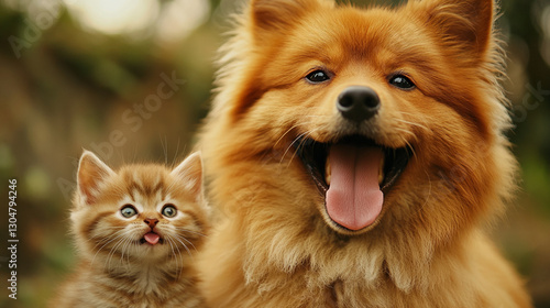 A playful kitten and a pomeranian dog, both with tongues out, sharing a joyful moment together outdoors, symbolizing friendship and happiness.