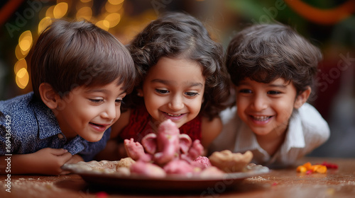 A playful scene of children sneaking modaks from a prasad plate during Ganesh Chaturthi Ganesha idol in the background giggles and crumbs everywhere kids stealing modaks