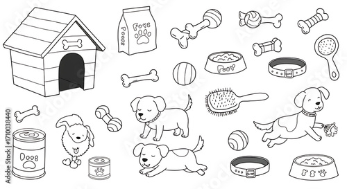 A playful set of black-and-white cartoon line drawings featuring a variety of dog essentials and activities. The collection includes a cozy doghouse, a food bowl, a tin of dog food, a brush, collars,