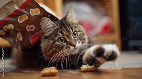 A plump cat pawing at a bag of treats, its persistence and determination evident as it tries to open the bag and access its favorite snacks.