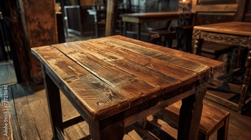 A polished wooden table stretches towards a blurred pub background, exuding a sense of depth and perspective. The rich, dark tones of the wood evoke a vintage charm and timeless character.