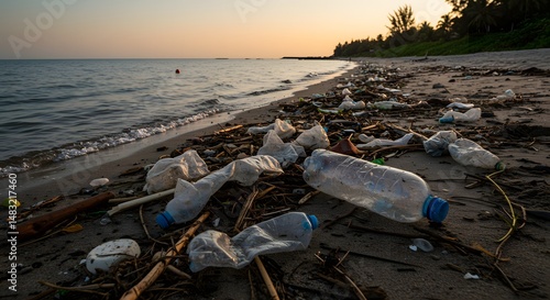 A polluted beach with scattered plastic waste during a vibrant and scenic sunset.