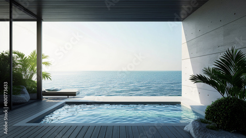 A pool with a view of the ocean. The pool is surrounded by a lush green plant. Scene is serene and relaxing