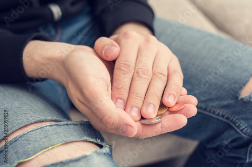 A poor male with a trifle, men's hands with coins, closeup, the concept of poverty of people, toned