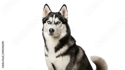 A portrait of a cute young siberian husky puppy and dog, a purebred domestic pet with black and white fur, looking forward while isolated as a canine mammal breed