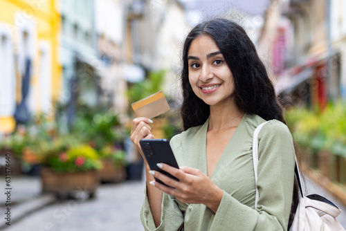 A portrait of a young beautiful Indian woman standing on the street, holding a crew and a phone in her hands, smiles at the camera. The photo is close