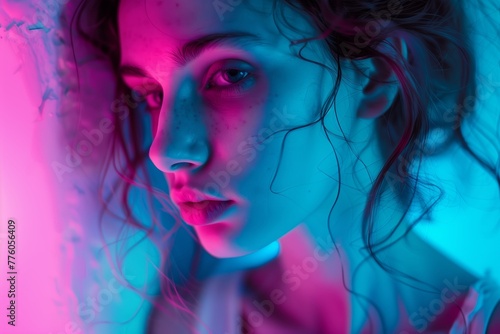 A portrait of a young woman with pink and blue neon light casting shadows and colors on her delicate features