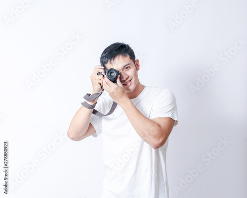 A Portrait of young asian man in white shirt and blue jeans showing gesture sign or devices