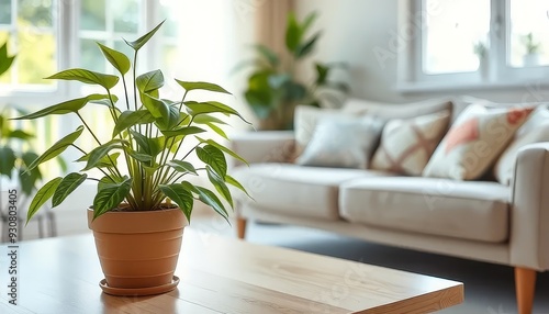 A potted plant sits on a wooden coffee table in a living room. The room is furnished with a couch and a couple of pillows. The plant adds a touch of greenery and life to the space, creating a cozy