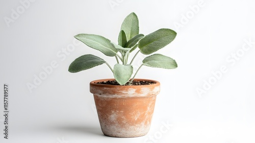 A potted silver sage plant with soft, silvery-green leaves sits against a clean white background.