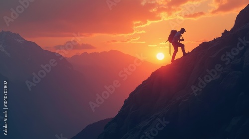 A powerful image of a person climbing a steep mountain, with the sun rising behind them in vibrant shades of orange and yellow.