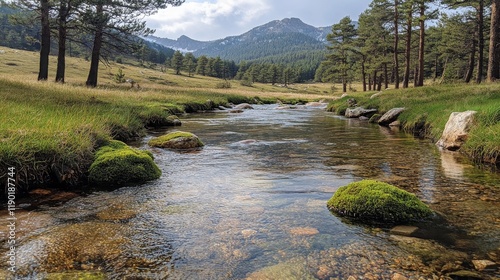 A pristine mountain stream flows through a lush valley surrounded by towering pine trees and distant snow capped peaks