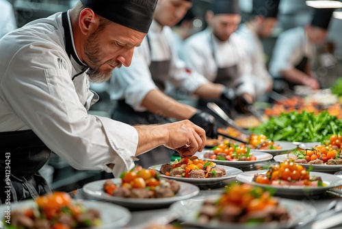A professional chef plating a dish in a high-end restaurant, focused on presentation and detail