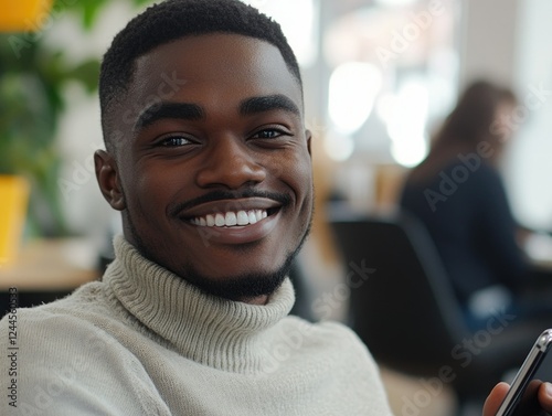 A professional image featuring a young man with a bright smile, looking directly at the camera. He is wearing a beige turtleneck sweater, sitting comfortably with a smartphone in hand. The background