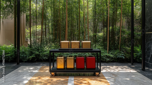 A professional photograph of a minimalist matte black luggage cart with golden and red leather suitcases, placed in a sunlit marble courtyard surrounded by tall, symmetrical bamboo trees