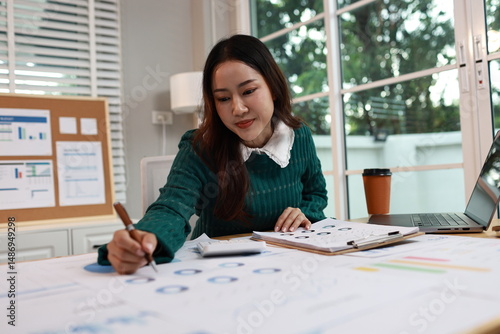 A professional woman wearing a headset works at her desk in a modern office, communicating with a client via computer.